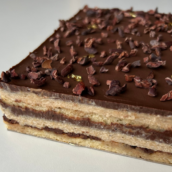 Sous ses couches savamment assemblées, le Velour Arrabica dévoile un équilibre de douceur et de caractère : le biscuit moelleux imbibé de café, la mousse onctueuse, la profondeur de la ganache noire, et le croustillant texturé qui vient réveiller le palais avec justesse.
