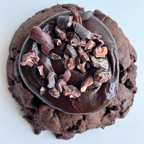 Ce cookie tout chocolat allie intensité et douceur en une bouchée. Sa base moelleuse, délicatement cacaotée, cache de généreux éclats de chocolat noir pour un jeu de textures irrésistible. Sur le dessus, une ganache fondante vient sublimer l’ensemble, apportant une touche encore plus gourmande. Le grué de cacao, parsemé en finition, révèle une amertume subtile et un croquant délicat, pour une expérience chocolatée à la fois brute et raffinée.