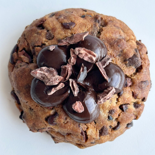 Un cookie de caractère, où la profondeur du chocolat noir s’accorde à la subtilité d’une touche de café pour éveiller les sens. En son cœur, de riches éclats de grué de cacao — fragments de fèves torréfiées — apportent une texture croquante et brute, rappelant l’intensité pure du chocolat à l’état naturel. Une création audacieuse et raffinée, pensée pour les amateurs de saveurs franches et intenses.