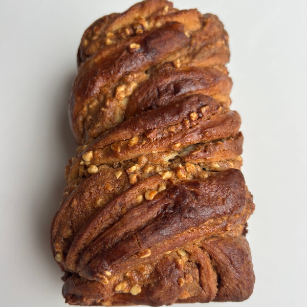 Une brioche moelleuse et fondante, roulée puis tressée à la main, garnie d’un praliné à la noisette généreux et de noisettes concassées torréfiées pour une touche de croquant irrésistible. Après cuisson, elle est délicatement imbibée d’un sirop à la vanille qui exalte les arômes et lui confère une texture encore plus fondante.