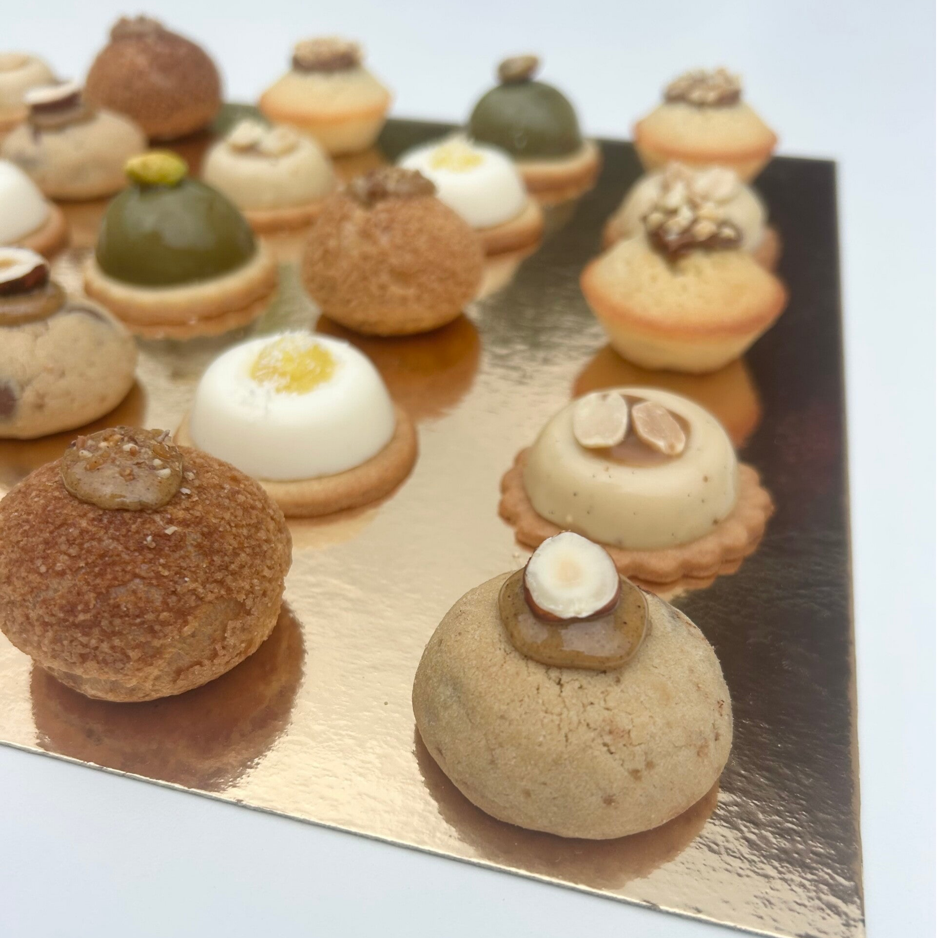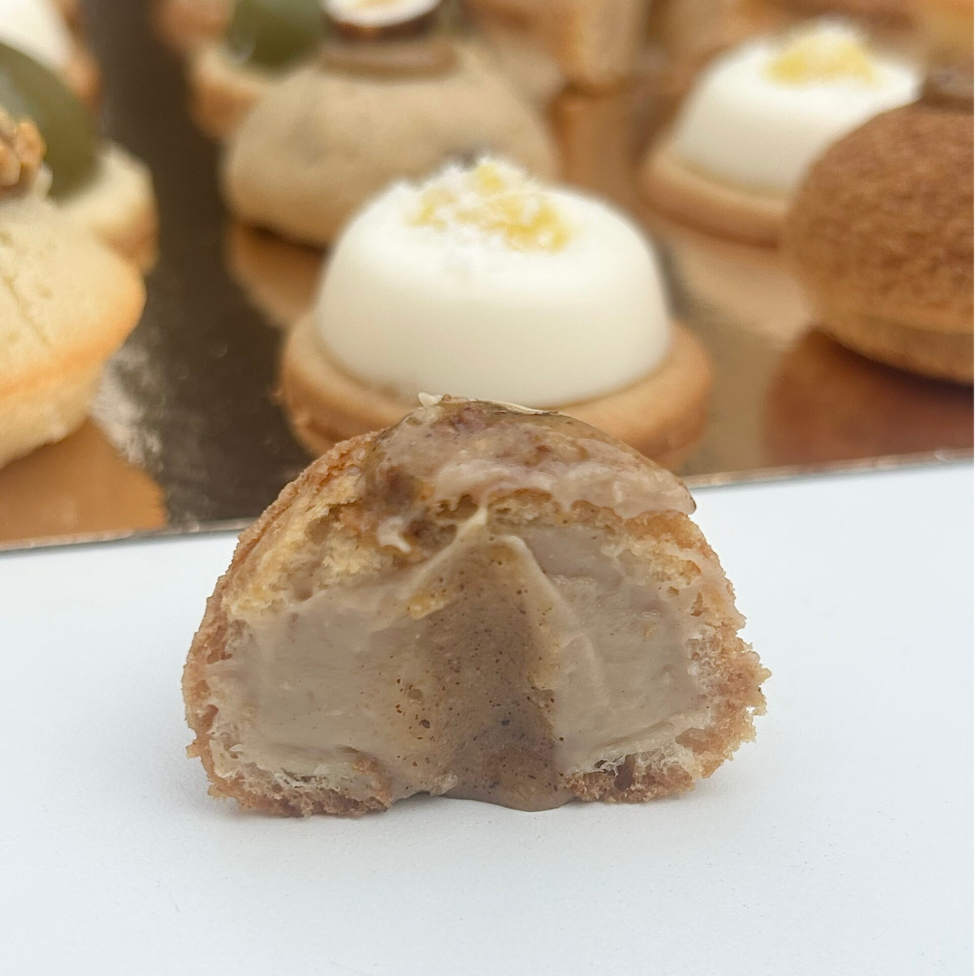 - Mini choux praliné : pâte à choux délicate garnie d’une crème noisette et d’un praliné fondant.