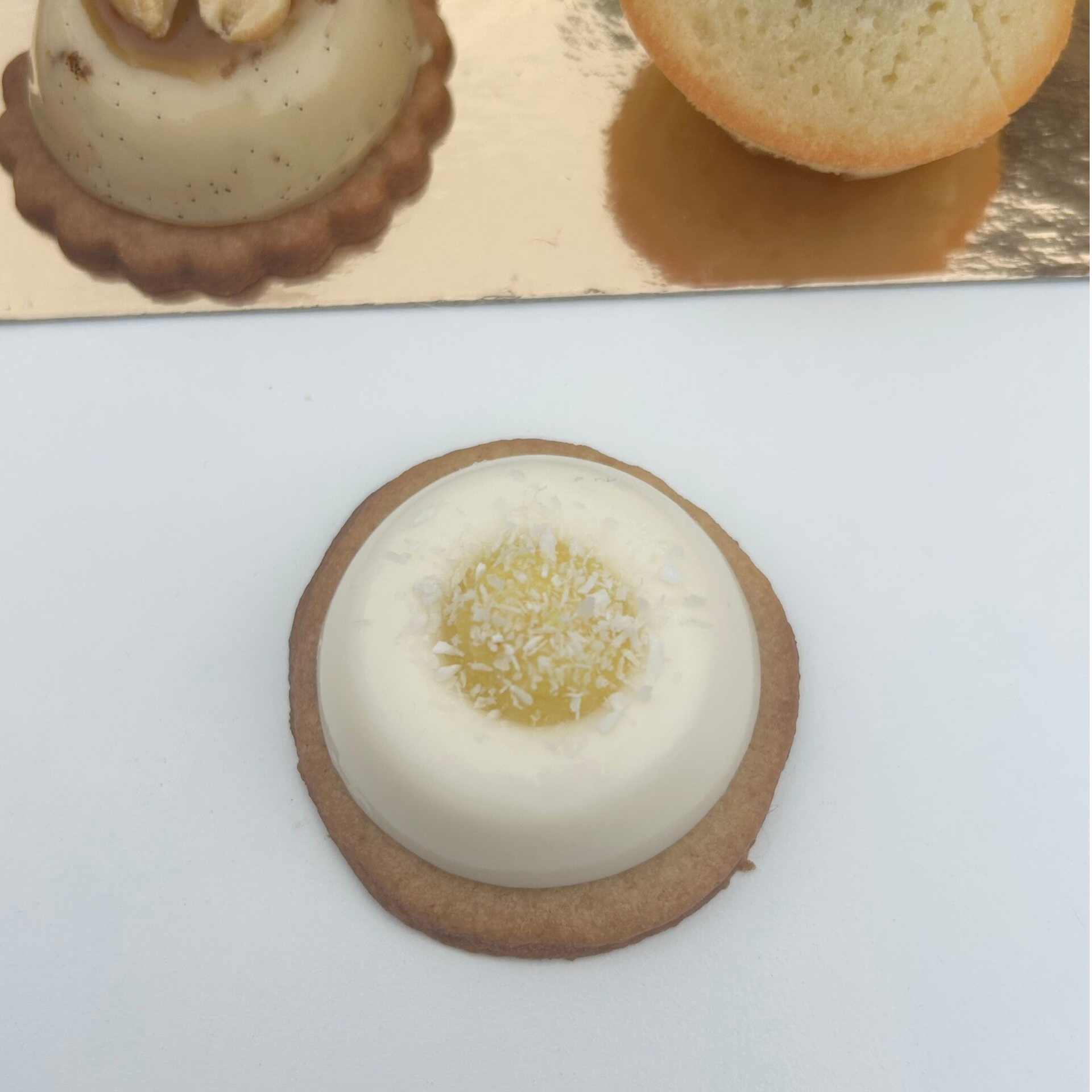 - Mini coco mangue : dacquoise coco légère, mousse coco onctueuse et dés de mangue fraîche à la vanille.