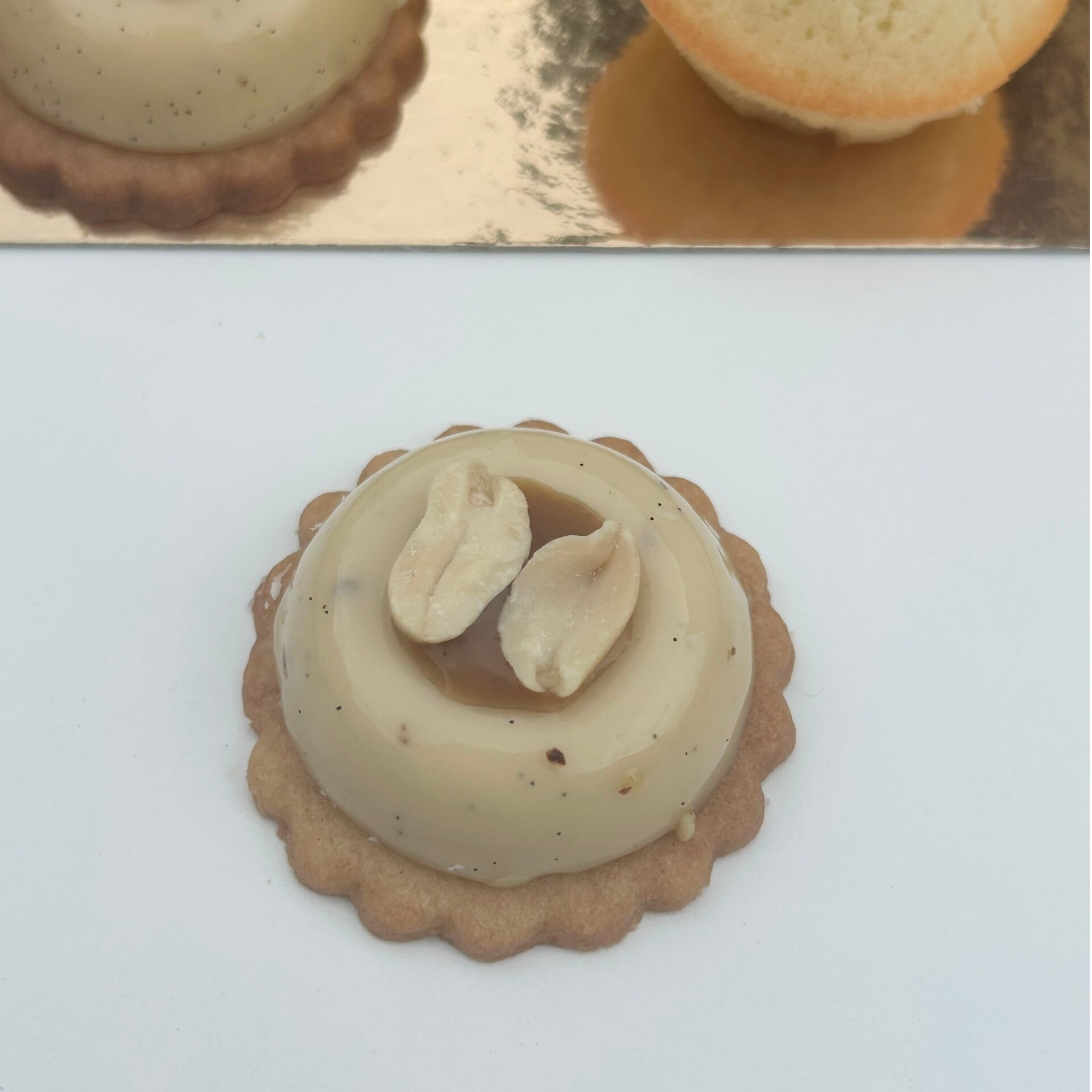 - Mini cacahuète caramel : crémeux vanille, caramel au beurre salé, cacahuètes grillées et pâte sucrée.