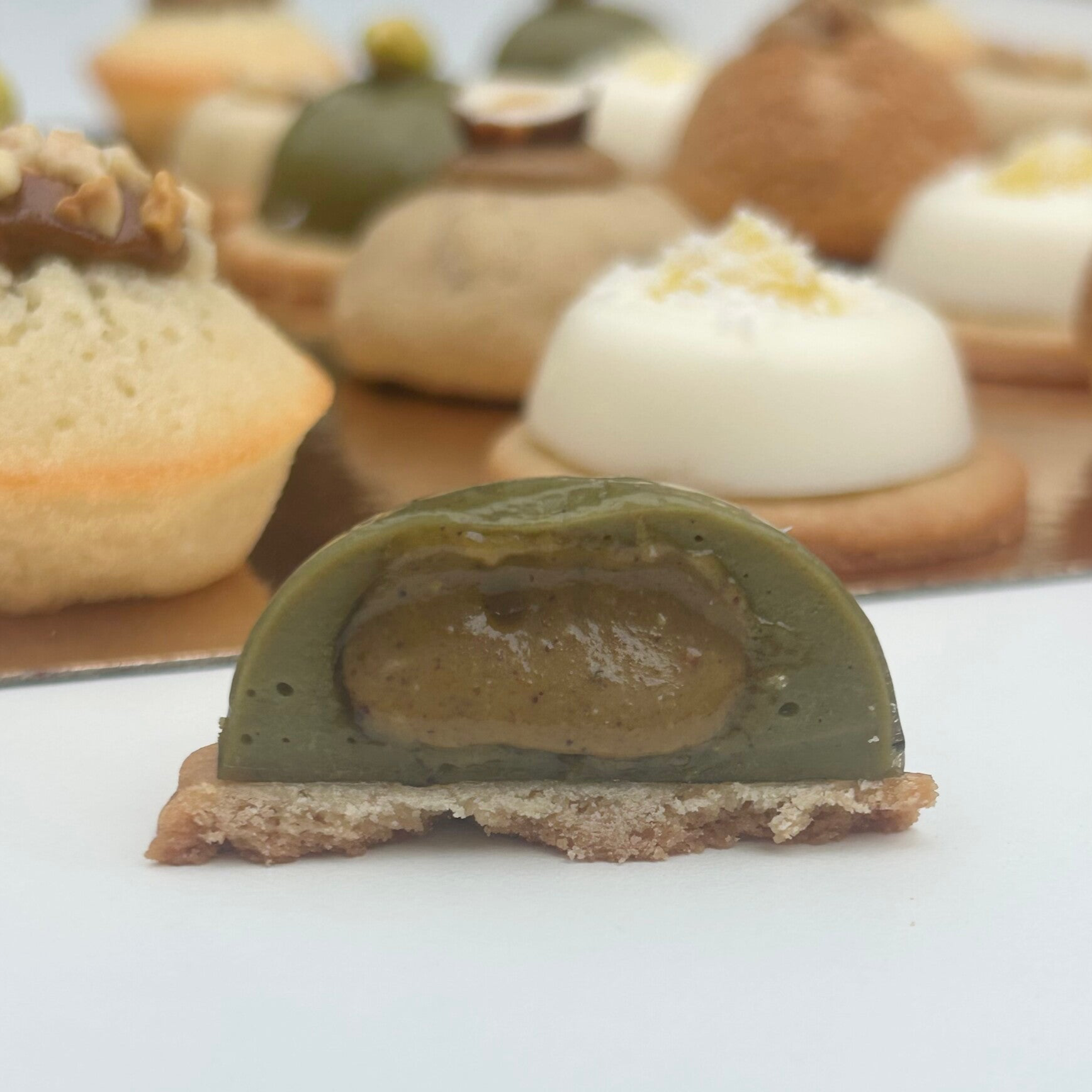 - Mini pistache : alliance onctueuse de praliné et crémeux pistache, sur fond de pâte sucrée.