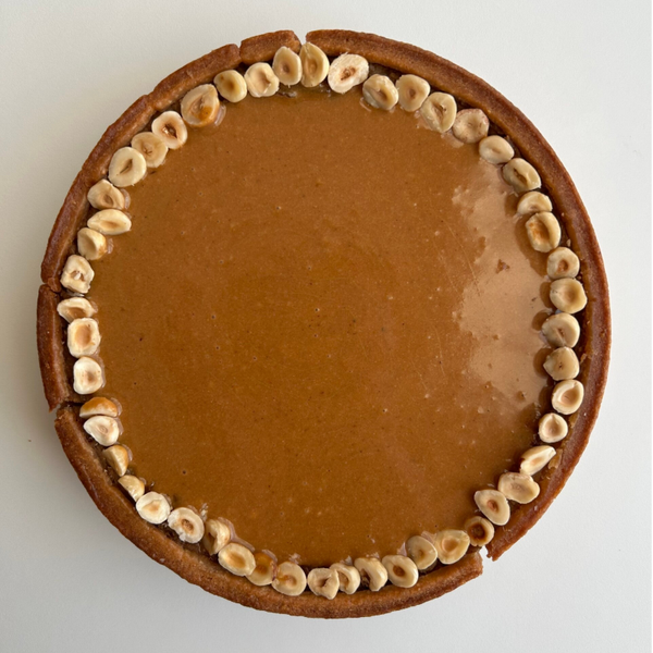 Sur une pâte sucrée dorée et croustillante vient se poser un appareil à flan délicatement parfumé, réalisé à partir de pure pâte de noisette pour un goût franc et généreux.